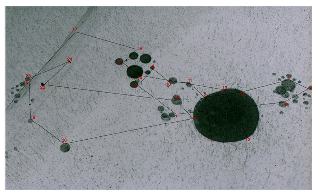 | FRACTAL ELLIPSE RETINAL EYE GAZE PHOTOGRAPHS This is a series of 12 photographs of air bubbles frozen in black ice, which have been scanned and fed into a computer program with Human Eye Gaze Response capabilities. The numbers indicate the human subject's order of choice and retinal attention across the image. These are similar to my earlier works with cats and fish however here, a human subject is used instead and progressive movement is created by the human subject's eye. |