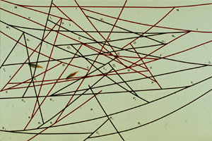 | CAT AND FISH PHOTOGRAPHS, the animal created a drawing by random movements. When he passed over a subjective point, (A), I photographed him at a slow shutter speed, showing movement and direction. I developed the negative: the point at which the camera stopped him created the second point, (B). I drew a line connecting the points. This process was repeated (A-Z) until several progressive series 'drawings' were achieved |